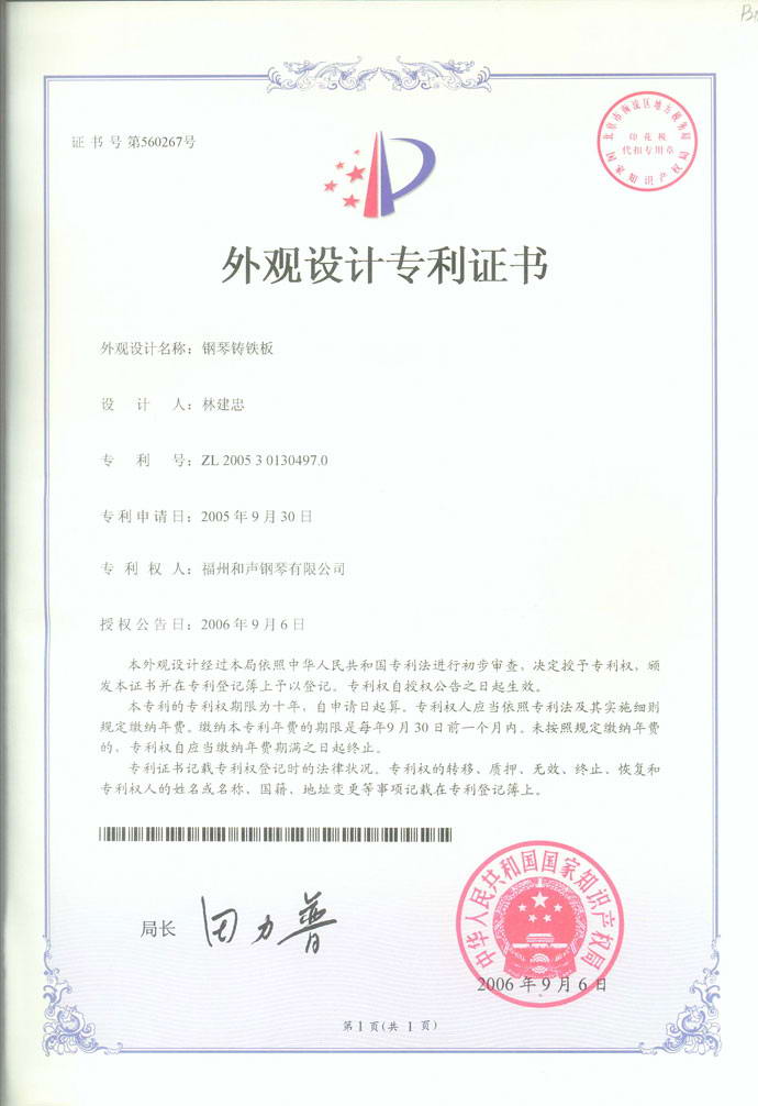 国内首创。这是一种应用“V”法真空铸造技术、铸有浮雕式图案的钢琴铸铁板,对一片一号码的铸件编码技术的应用既能保证生产过程的品质跟踪,又能作为防伪标识,铸铁板内部没有气泡,稳定性大大优于传统翻砂铸铁板。(经典“R”系列、高端“G”系列产品配置)