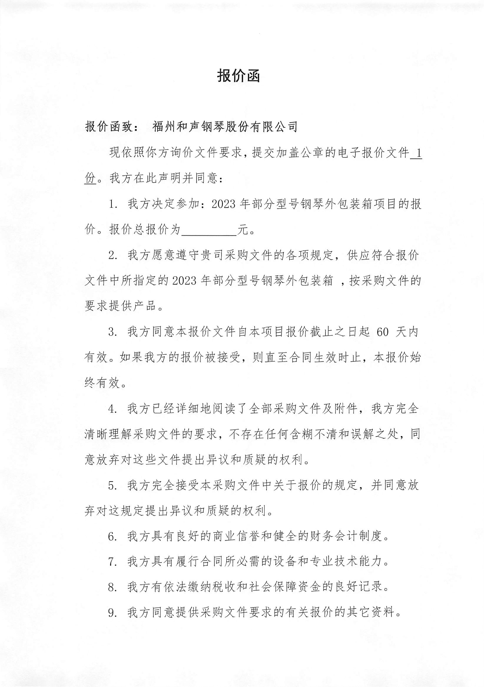 1、询价文件获取方式:报价单位可在福州和声钢琴股份有限公司官网http://m.harmonypiano.cn/)“新闻中心-网站公告”中查阅相关文件,或联系询价联系人获取询价文件,由询价联系人以电子文件形式发送询价文件。